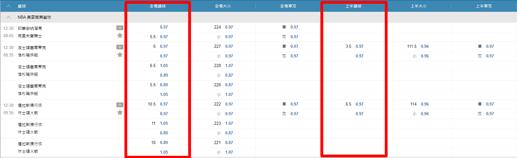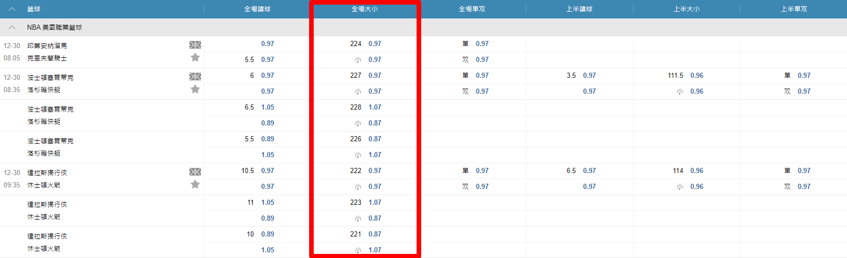 舉例:獨行俠112.5、公鹿117.5、總分224.5 ←這樣就會是三個盤口