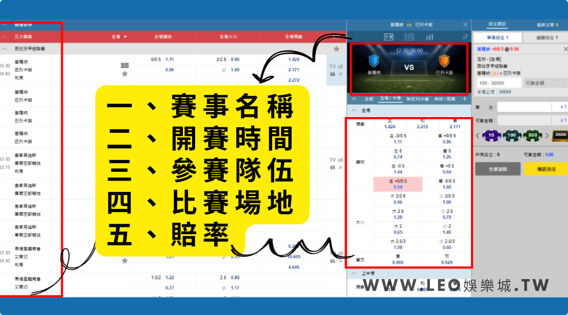 體育投注的盤口由幾項資訊組成:
